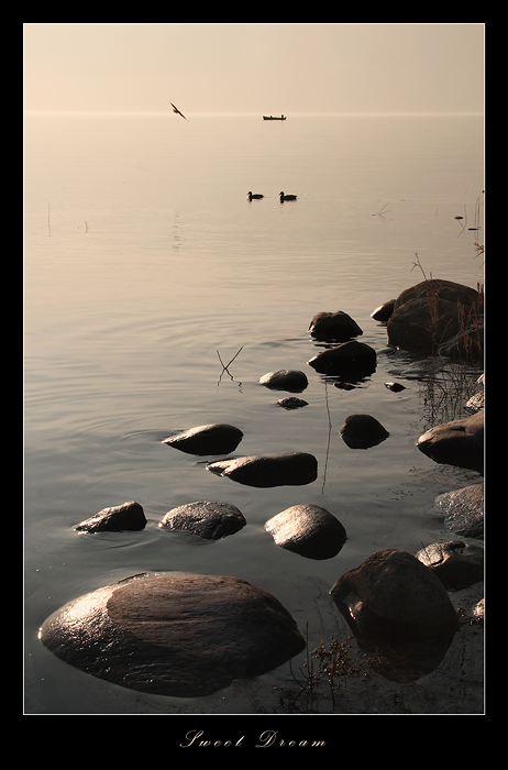 mi piace la diagonale sei sassi (splendido quello ellittico in pp, bagnato per metà), e l'aspetto particolarissimo dell'acqua: talmente liscia da fare l'effetto di un calmante per chi la osserva; parere personale opinabilissimo: avrei clonato i fili d'erba e gli uccelli.