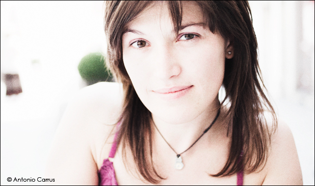 Mi piace molto di questo ritratto il taglio che mantiene ampia e luminosa l’inquadratura, ma che si fa al tempo stesso moderatamente stretto alla ricerca di un contatto intimo e mai invadente con la modella ed il suo sguardo intelligente ed elegantemente ammiccante nel lieve sorriso che distende le labbra.