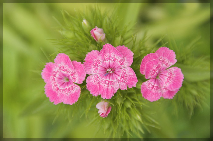 trittico che sboccia dal verde , un bell'impasto cromatico molto bello il fiore centrale.