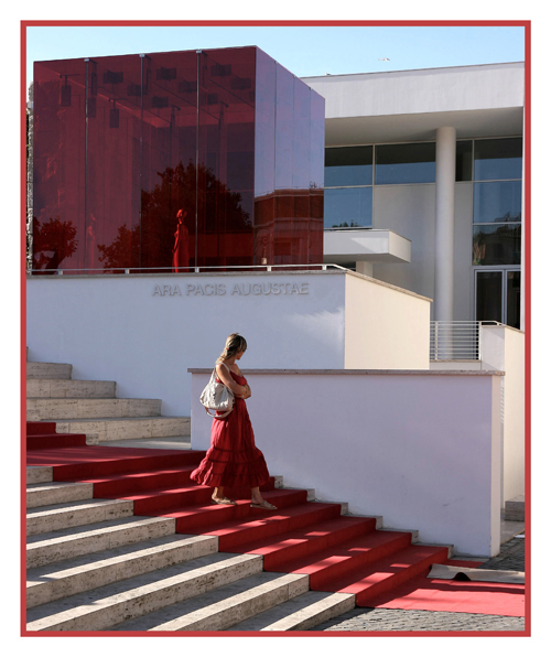 Bellissima la bicromia di quest'immagine, praticamente è tutto rosso o bianco. La composizione è perfetta, le pareti dell'edificio si accavallano sulla prospettiva creando una forte tridimensionalità; le linee formate dalle scale portano verso il centro del fotogramma; non ci sono linee cadenti nè distorsione dell'obiettivo (le hai corrette con PS?); bianco e rosso si alternano perfettamente dal basso verso l'alto; la donna in rosso ha perfino la borsetta bianca, qui sei stato molto fortunato