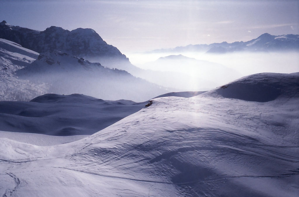 la vista spettacolare delle cime e delle valli al sorgere del sole con la leggera nebbia mattutina che pian piano si dissolve.
