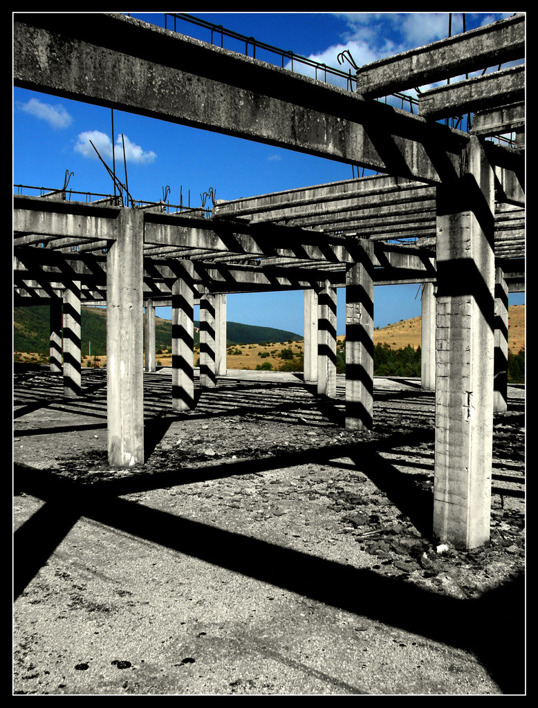 Molto bella la simmetria (l'asimmetria in realtà) e le strisce d'ombra. Magistrale la contrappozione dei colori del paesaggio contro il grigio assoluto del cemento. Bravo.