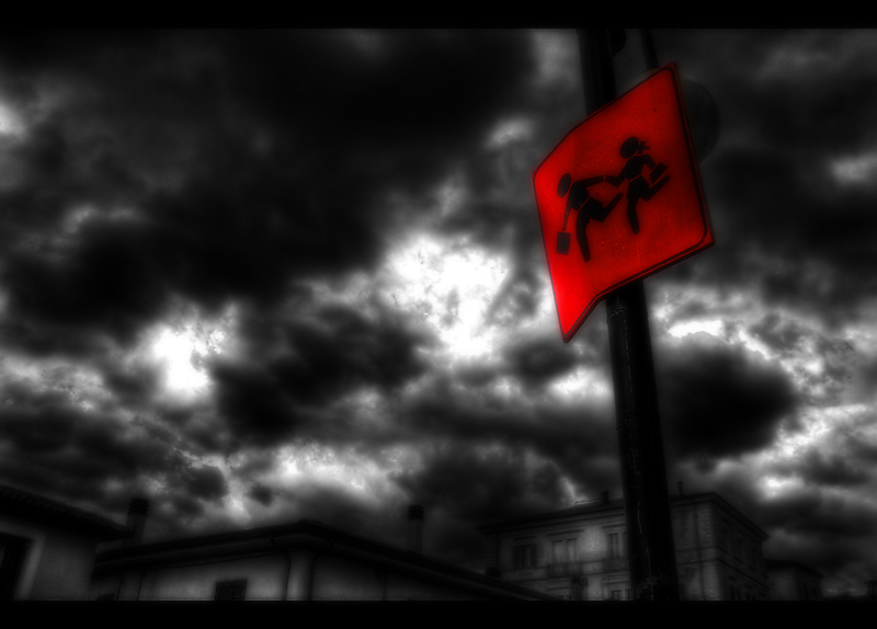 atmosfera molto cupa e misteriosa.. quel cielo così scuro con quei due colpi di luce a squarciare le nuvole e l'effetto che hai applicato, portano in primo piano questa ''insegna'' con un colore invece così vivo e acceso..