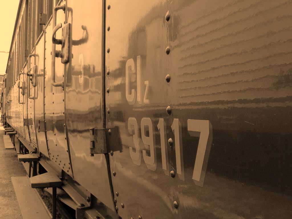 | ciao, il viraggio seppia l'ho voluto dare oltre che per conferire un aspetto invecchiato, per camuffare i moderni colori delle locomotive che si riflettono sulla fiancata. La vecchia carrozza anni '30 Clz della serie 39.000 viene comunemente chiamata Centoporte.