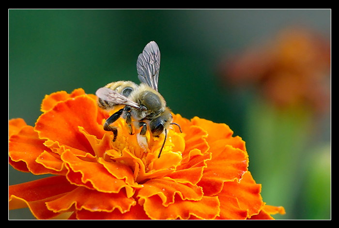 bello scatto,nitida e ben maffata l'ape,io avre preferito uno sfondo che continuasse con sfumature di verde,ma non è colpa tua se li cera un altro fiore Ok!