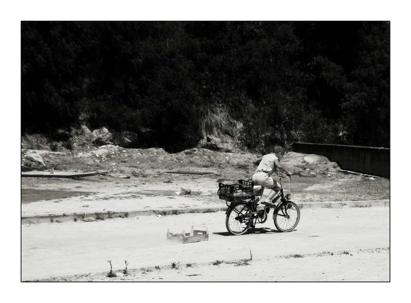 per me la cassetta è la protagonista dello scatto ed il bambino in bici è un comprimario.