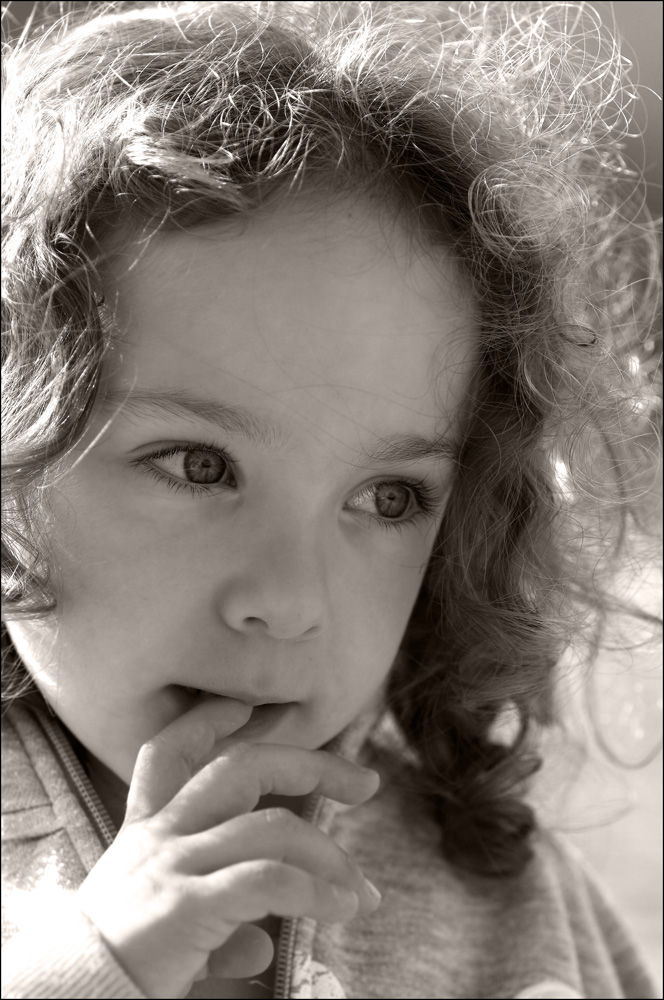 Grande espressività questo ritratto dal forte accento evocativo, capace di catturare e restituirci con semplicità e naturalezza, uno di quei rari momenti di pausa tra un'esuberanza e l'altra: ...lo scatto pare sospendersi cioè, nella gestualità della mano che è capace, insieme allo sguardo fuori campo, di rievocare l'improvviso quanto personale viaggio della piccola in un mondo di chissà quanti piccoli e grandi pensieri.