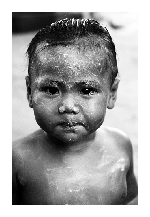 Gli occhi di questo bimbo sono talmente espressivi che bucano lo schermo ed arrivano fino al cuore di chi osserva... contengono il brio e la vivacità che un piccolo di quest'età dovrebbe poter riflettere e danno, fissi ad osservare il fotografo, un senso fortissimo di comunicazione e di interscambio... Il bianco e nero, che non mi sento di giudicare tecnicamente, a me arriva però intenso ed efficacissimo, ricco di particolari e più emozionante di una qualsiasi foto a colori. Il viso è graficamente attraversato dai segni bianchi di quella che forse è un tintura, un trucco per una festa del villaggio.... oppure il bimbo è semplicemente bagnato e segni di sapone gli rigano la pelle.... comunque sia anche queste tracce donano fascino alla foto, la rendono particolare.