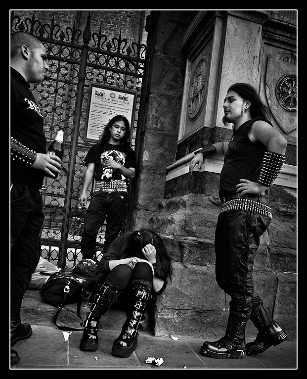 ... il taglio del metallico ominide non mi disturba .. il racconto c'è ed invoglia a leggere la scena .. scattare senza inquadrare .. ahi ahi .. il codice dello streepher prevede sanzioni ... sempre meglio delle legnate nei denti dei suddetti metallari ...
