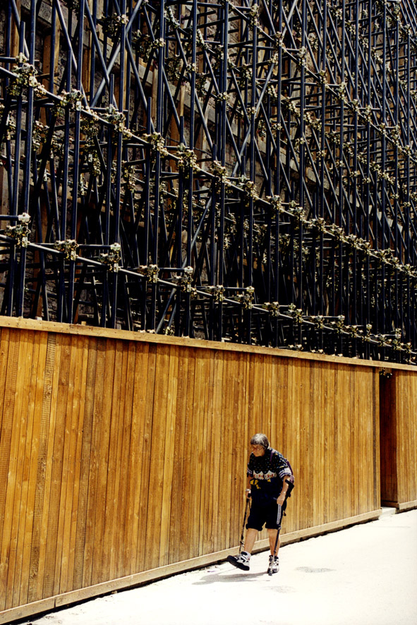 mi piace molto l'intreccio/confronto tra l' impalcatura dell'edificio e l' impalcatura (le stampelle) della persona.complimenti per il colpo d'occhio!!!  |