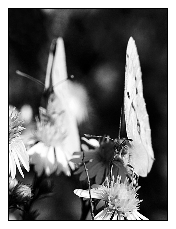 Caro Fabio, non ho letto ancora gli altri commenti. Non è che la pui far vedere anche a colori. Pur avendo un ottimo potenziale, non riesco a leggere bene il soggetto, la seconda farfalla si nota appena anche perchè la parte dove posa la farfalla risulta sovraesposta tanto da rendere davvero fastidiosa la lettura di tutta la foto. Anche il soggetto in pimo piano si confonde per tonalità con cosa c'è dietro. FAbio sai come la penso e sai che per quello che può contare il mio parere, ti dico sempre quello che penso.