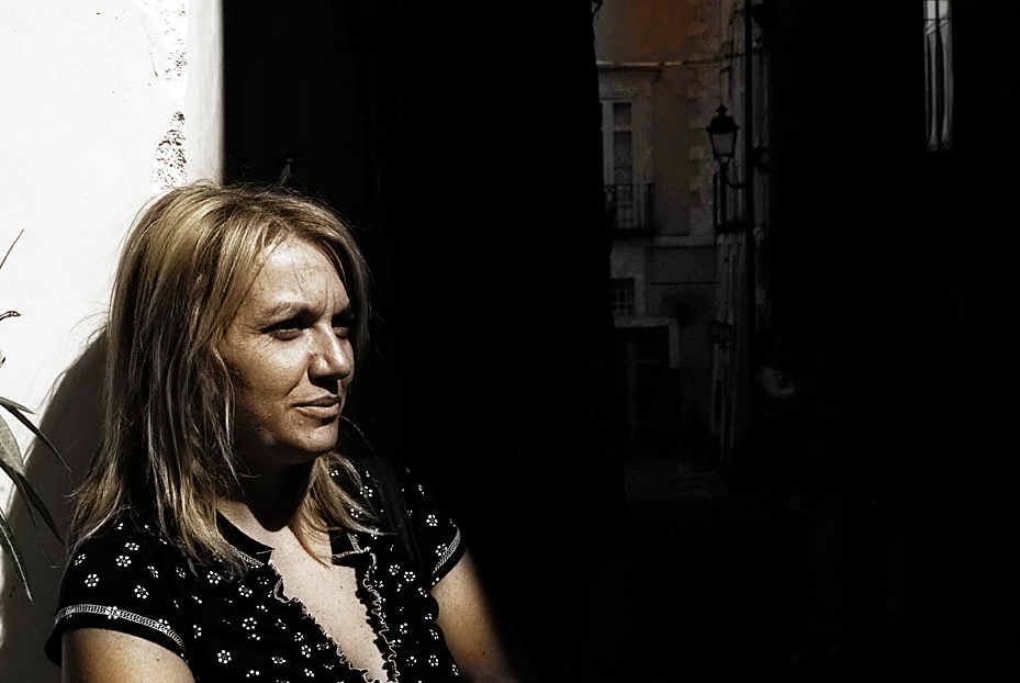 ..un'illuminazione a forte contrasto che rende il viso drammaticamente vero, con quell'espressione così pensierosa che si contrappone all'intelligente composizione, dando spazio e buona leggibilità al vicolo scuro.. Ok! Smile
