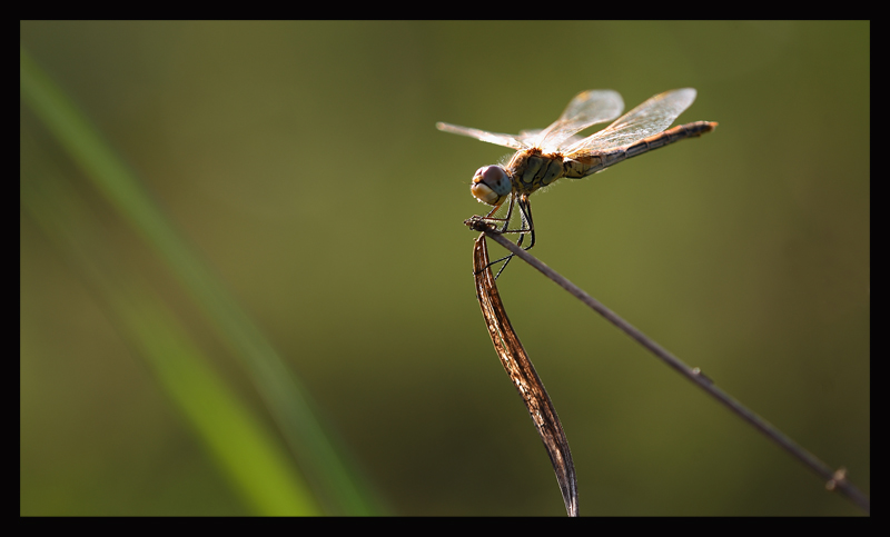 Per il resto una macro bellissima, soprattutto per la luce particolare e lo sfondo uniforme. Quei fili d'erba sfocati danno inoltre il giusto peso alla foto bilanciandola nella parte sinistra che altrimenti sarebbe stata troppo "vuota" e non so se è un caso o no, ma sono anche inclinati nello stesso verso del rametto dove posa la libellula...
