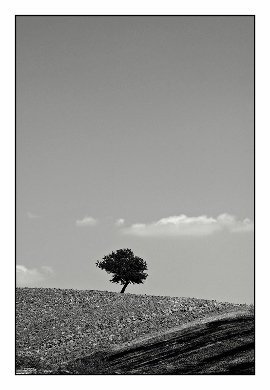 Ma io non so dove penda l'ago della bilancia ma a me le immagini così pulite piacciono moltissimo, il cielo vuoto nella parte alta forse non aggiunge niente ma penso che nemmeno tolga... anzi rafforza quella che vorrebbe essere un immagine minimale ch in realtà nella parte basse non lo è nemmeno tanto vista la ricchezza di particolari del terreno dove nasce l'albero e i disegni di quello nero sotto che nel passaggio taglia in diagonale il 1° terzo.