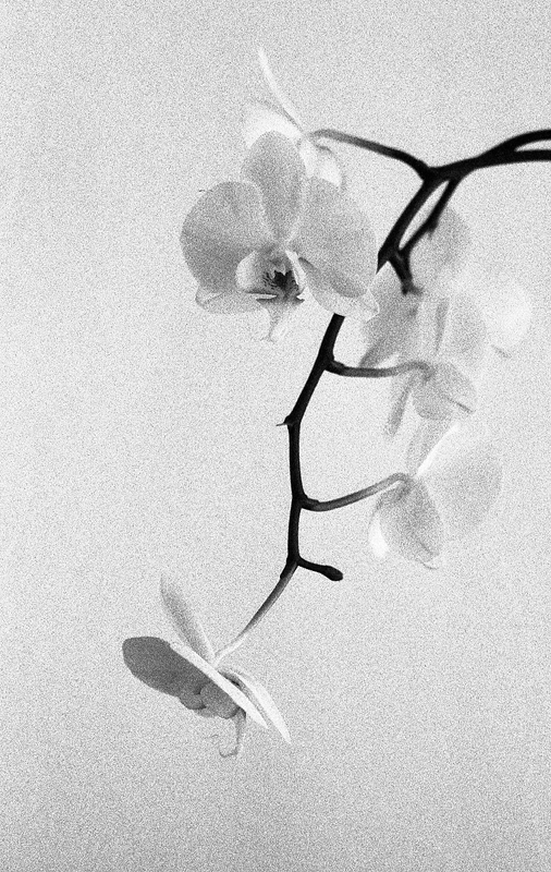 La Delta 3200 era già sù... ed ho voluto sperimentare l'effetto su queste orchidee contro uno sfondo bianco, speravo appunto che si dissolvessero nella grana (splendida) lasciando una delicata traccia di sè, tutte tranne l'ultima, quella collegata allo stelo che guida lo sguardo diagonalmente da destra a sinistra.