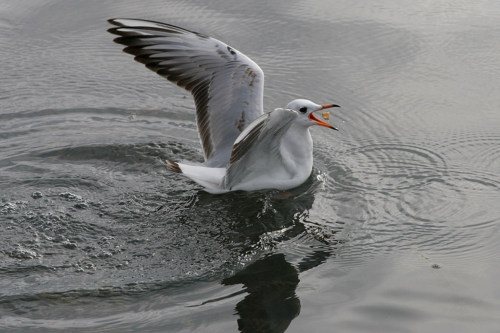 Gabbiano ghiottone intento a prendere al volo un pezzo di pane.