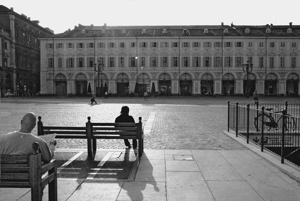 Grande la spazialità racchiusa in questo scatto, scandita da persone e cose disposte su più piani e dalla fuga della trama disegnata sulla pavimentazione.