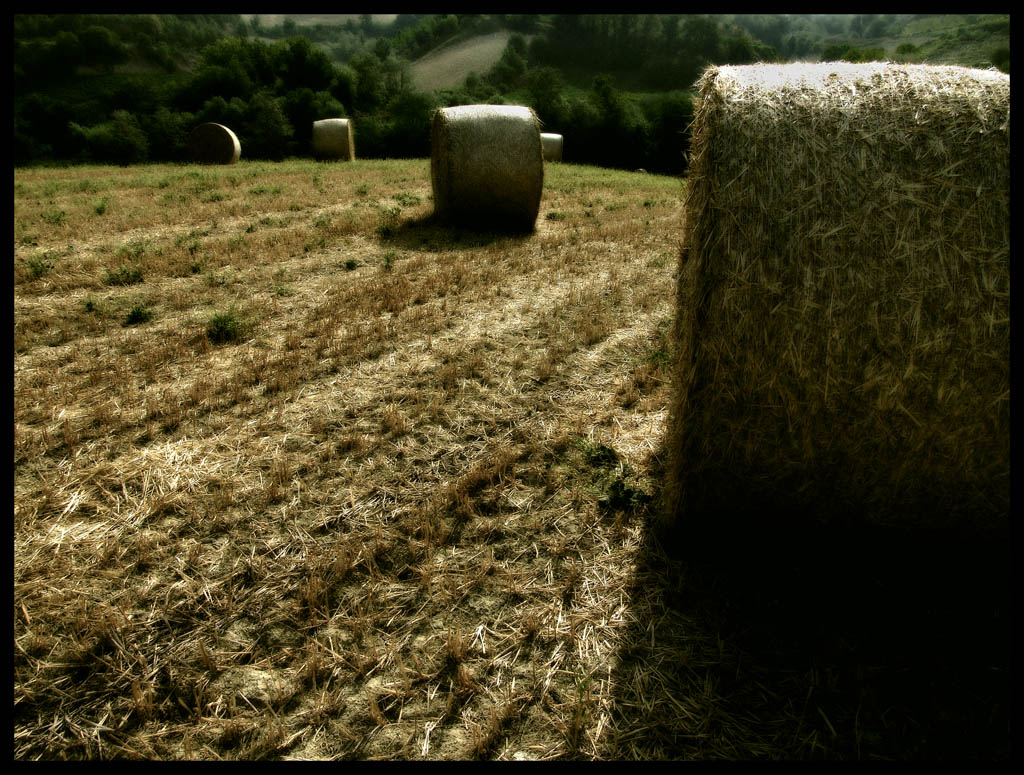Per quanto riguarda l'inquadratura non potevo salire di più perché come noterai nella parte più alta il sole che avanzava rischiava di farmi inserire delle bruciature (ho corretto un po', ma anche così si vede che ci sono delle parti un po' più chiare)... lo scatto non lo posso rifare perché le balle di paglia le hanno tolte, ma dopo inserisco qualche altra immagine fatta quel giorno così ti fai un'idea migliore del paesaggio che c'era