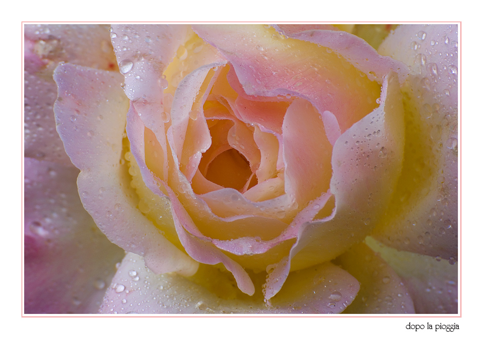 un bel close-up si respira la freschezza della rosa e le gocce aiutano la lettura delle tonalità