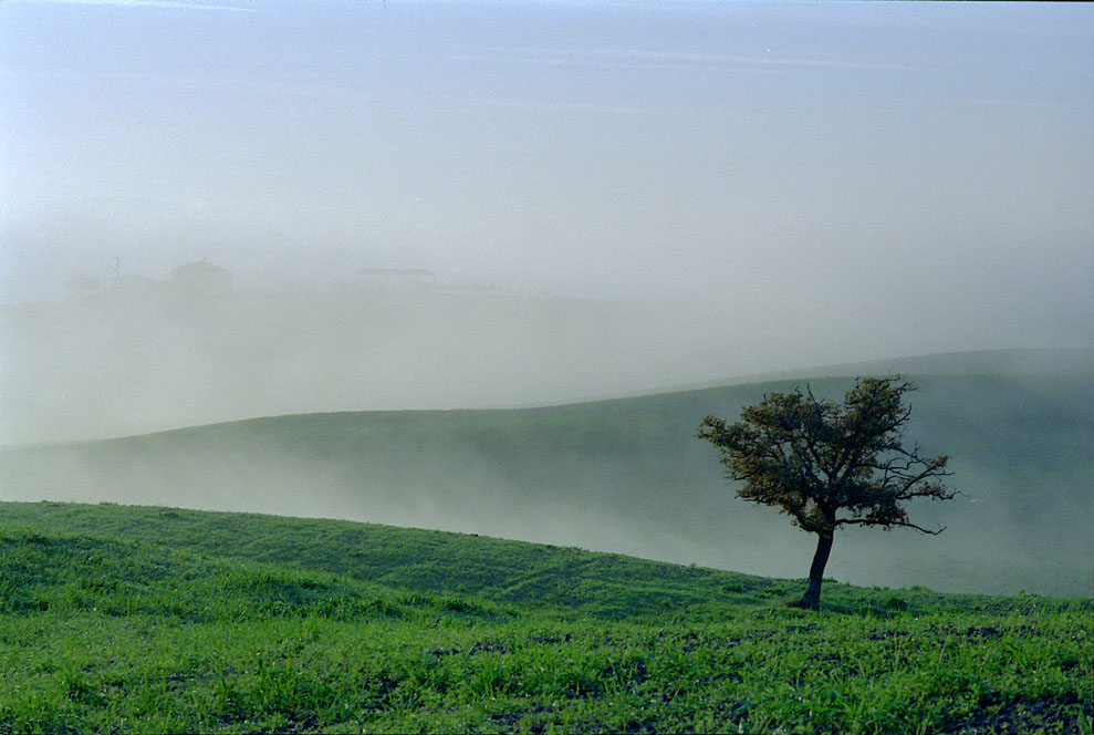 Piani che si rincorrono, scampoli di realtà che fanno capolino dalla lieve foschia ed il soggetto, di una autosufficienza quasi allegorica, che si staglia ombroso in primo piano.