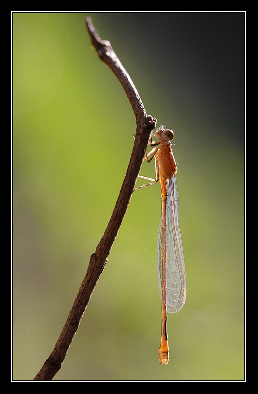 A me piace moltissimo la composizione che trovo ben equilibrata,forse solo qualche mm in alto per non lasciare lo stecco a raschiare il bordino. Mi piace la disposizione del posatoio e della libellulina appesa e come questi due elementi si completino nello sfondo. La diagonale di verde è proprio una chicca e il nero in alto non mi disturba anzi, controbilancia ed esalta la libellulina dalle ali opaline.