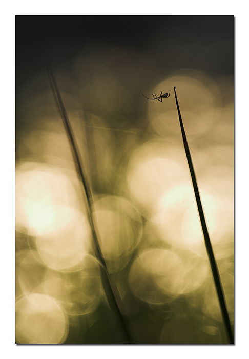 Il ragnetto lo sa bene e con cautela s'incammina lungo quell'esile filo di seta, e noi tutti a chiederci come farà a non lasciarsi distrarre dai bagliori dorati alle sue spalle? A immedesimarmi nel bestiolino so già che finirei spiaccicata per terra!