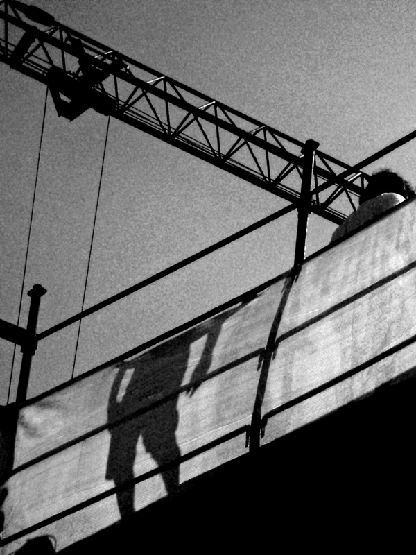 La testa a fianco ha significato allegorico, come mente solo al lavoro, essendo che la gru va a "trapassarla" in pieno, cercando di avere un'occhio compositivo..