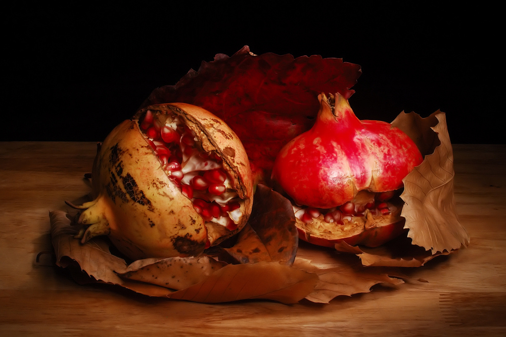 Composizione molto ben riuscita.... la gestione della luce è molto buona in forma generale, il melograno di destra forse spara un po troppo....
