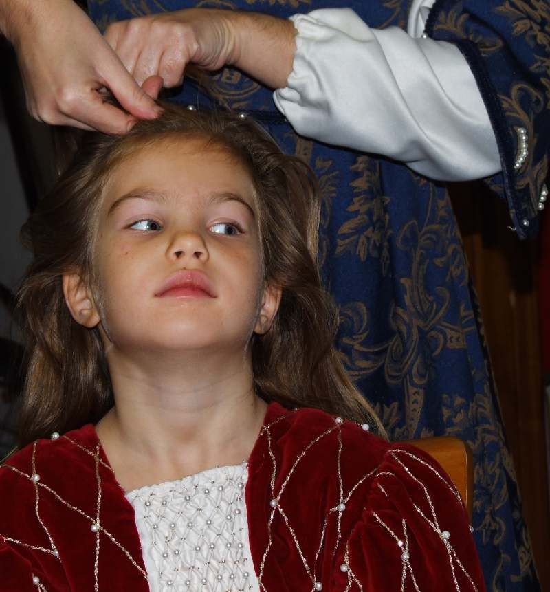 Personalmente non amo molto questo genere di manifestazioni. Ma quando tre anni fa portammo Ester a vedere una sfilata, per giorni interi non fece che parlare delle "principesse". Così, quando si è presentata l'occasione di farla partecipare, ci è sembrata una crudeltà non approfittarne. Morale: una domenica di ottobre, il bravo paparino se l'è portata in contrada, scoprendo che avrebbe potuto dormire un'ora in più, se solo si fosse ricordato dell'ora solare; ha assistito devotamente alla vestizione e alla pettinatura, poi si è sorbito tutto il resto.