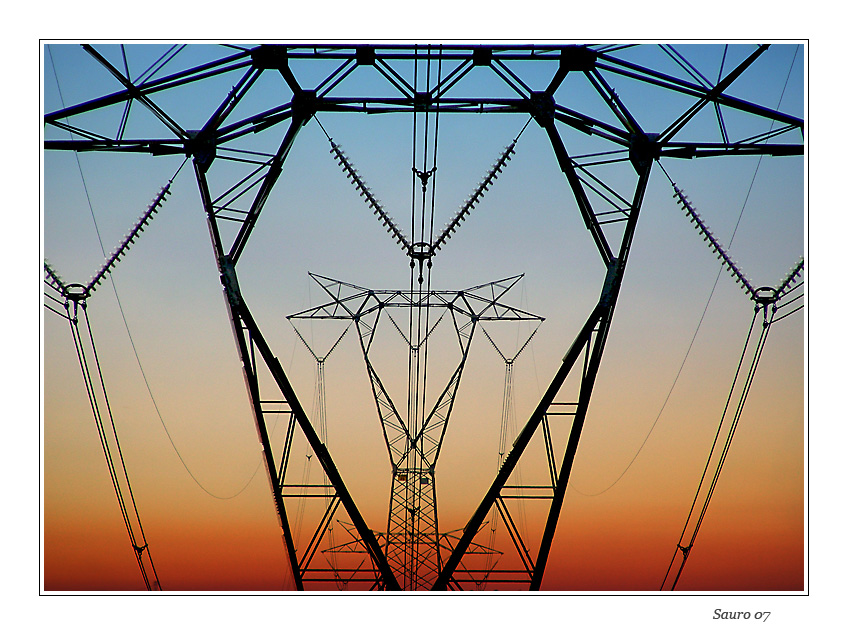 Topo Ridens ... come ti han fatto notare c'è qualche piccola imprecisione, è vero (in scatti di questo genere la precisione è assolutamente richiesta), ma a parte questo la trovo bellissima! Hai saputo sfruttare al meglio i tralicci dell'alta tensione dando luce a una composizione geometricissima e grafica... un insieme di forme e linee davvero imprssionante! bravo!