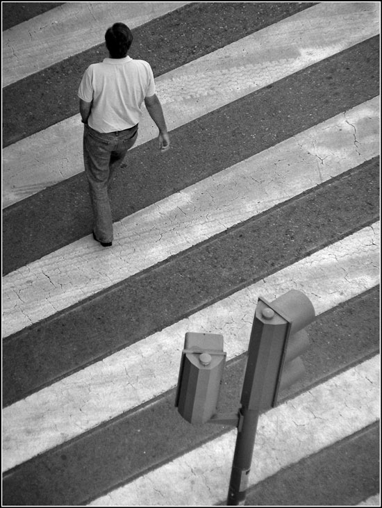 Non è un'azione molto interessante ... una street si fonda su una azione che cattura lo sguardo e su un contesto ... forse allargando avresti incluso altri passanti; quì la cosa migliore sono le verticali dati dalle strisce pedonali; da un punto di vista tecnico noto troppi grigi.