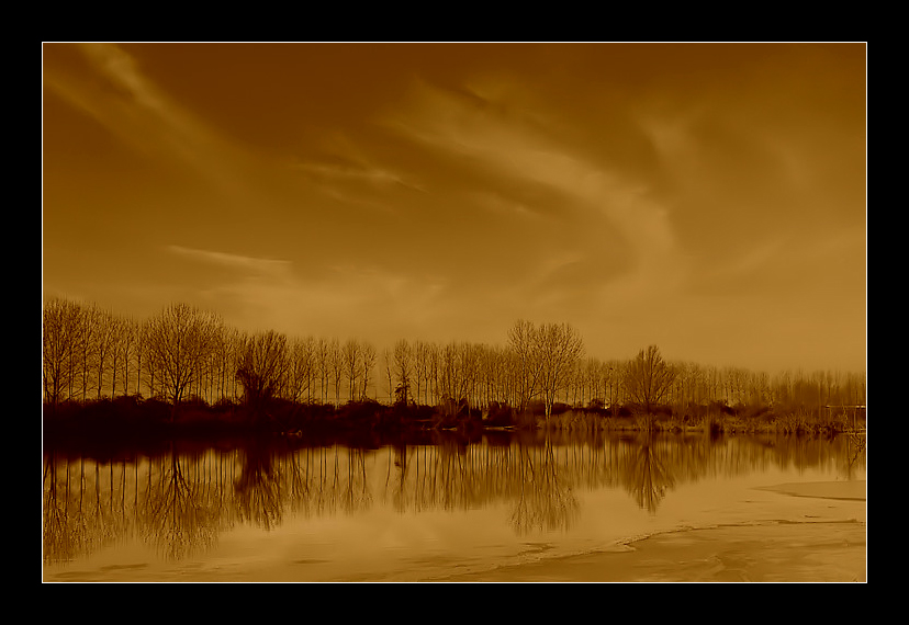 Gradevole questa filiera di alberi che si specchia nell'acqua stagnante e che divide in due il fotogramma. Bello anche il viraggio energico color tabacco.