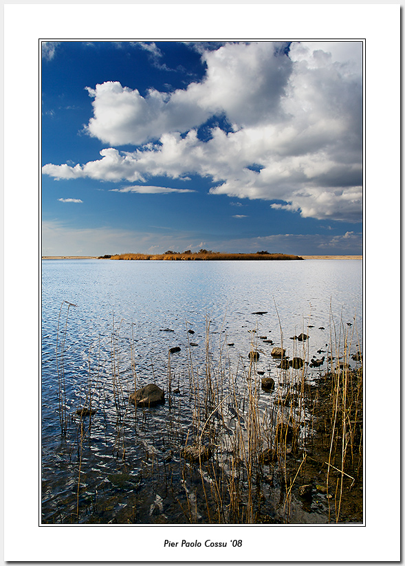 Immagine davvero bella.. per me ottimale la scelta di tenere perfettamente nel centro l'isoletta di terreno in lontananza.. così come la scelta dell'inquadratura della parte bassa, che crea un bel primo piano.. con questi steli di erba secchi che si alzano verso il cielo, in una tensione apparente, addolcita dal bel blu del cielo e dal bianco candido di quelle nuvole.. bello anche il leggero movimento dell'acqua, che crea interessanti riflessi di luce nel primo piano e punti più scuri man mano che ci si allontana..