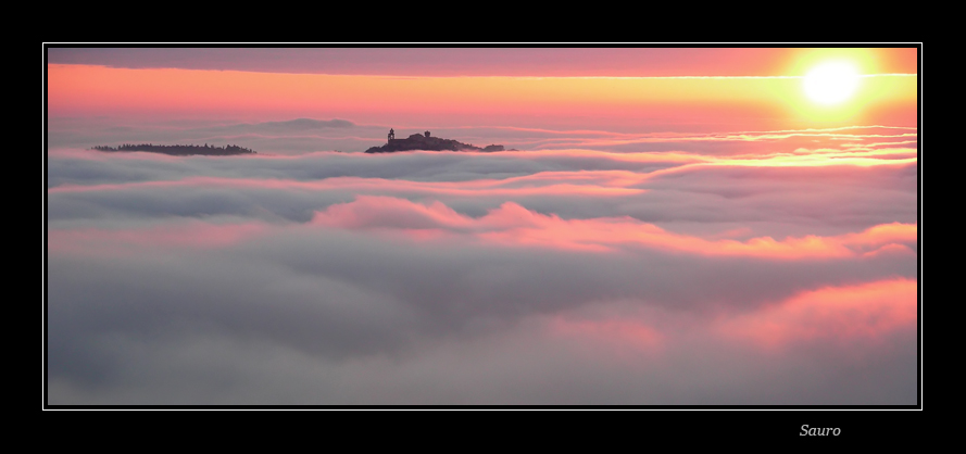 Davvero unica la leggerezza di queste nuvole e quel riflesso dorato roseo che quel sole le sta regalando.. così come splendida è la porzione di paesaggio che sbuca da queste nuvole..