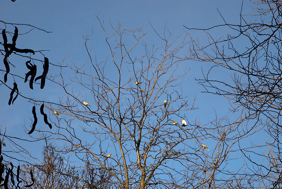 ho tenuto l'inquadratura larga perché mi piacevano sia i rami a sn con quei baccelli ed i rami sulla DX. Avrai notato altri miei scatti dove amo avere in PP ravvicinato qualcosa, ho la sensazione di dare + profondità all'immagine, nel caso specifico i 3 piani rami uccelli e cielo.