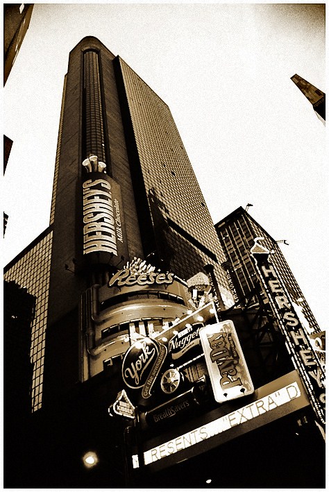 Bella questa visione antica della città invece così moderna.. fatta di luci, pubblicità giganti, neon, vetri senza numero.. Mi piace molto il viraggio e la grana che c'è su tutta l'immagine, le da' una bella atmosfera, portando lo scatto davvero indietro nel tempo, facendoci respirare quell'aria di tempo passato..