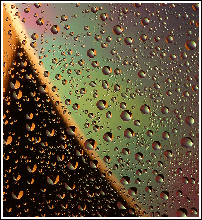 Sono delle goccioline spruzzate su domopack steso su una cornice. Per lo sfondo, posizionato a circa 30 cm dalle gocce, ho usato dei ritagli di copetina di rivista. Il tutto ovviamente posizionato in orizzontale.