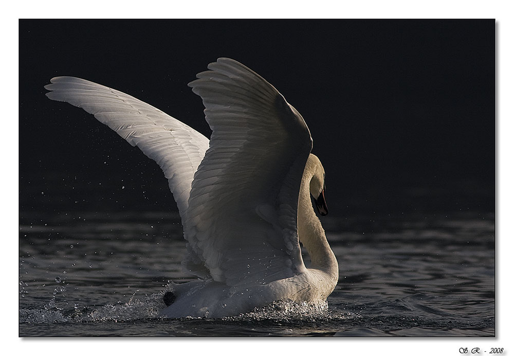 .......perchè è troppo bella e ben eseguita questa immagine..... la ripresa non frontale a mio parere è molto efficace, ci permette di apprezzare con questa luce la lieve trasparenza delle ali in apertura e il gioco di dorature leggere che si allargano sul collo in lunghezza; la festa di spruzzi si unisce poi al movimento a pelo d'acqua per creare dinamica e vivacità naturali.