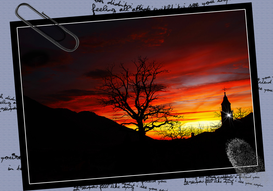 Specifico, la foto di base è mia, di falso ci sono gli alberi, la luce sul campanile, l'impronta, la graffetta e lo sfondo...