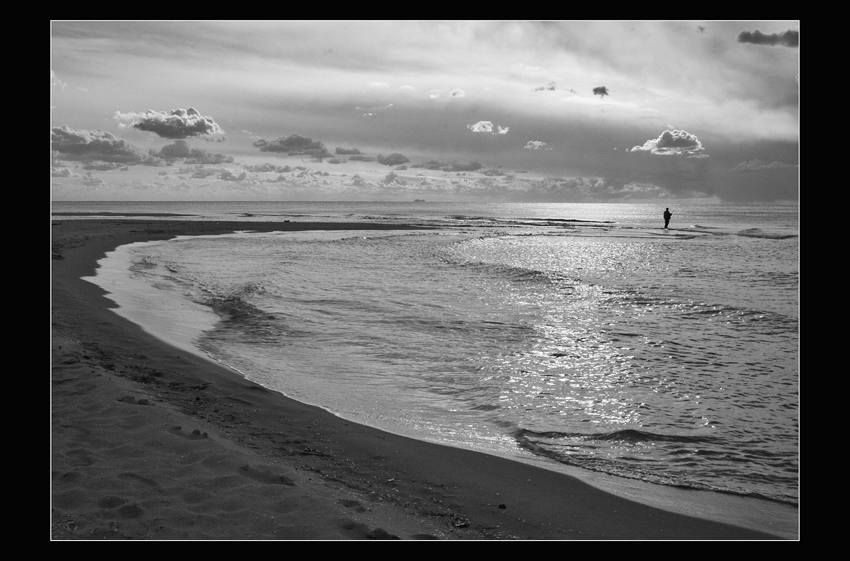 la gamma di sfumature è ricca; il b/n risulta quindi, anche se l'inquadratura comprende pochi elementi, di ottimo impatto;la sabbia in pp è serica, invitante; le nubi sono fascinose, e dinamizzano la bella composizione