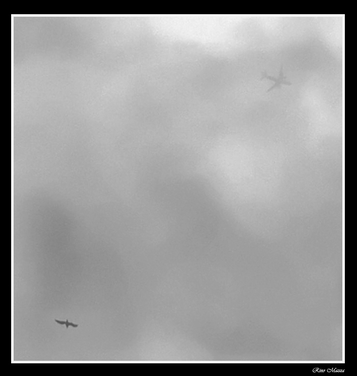 ti spiazza.... ti incolla allo schermo a cercare di far emergere i due voli nella foschia... ( soprattutto quello meccanico.....) e a cogliere il segreto di questa diagonale ideale formatasi per un attimo.