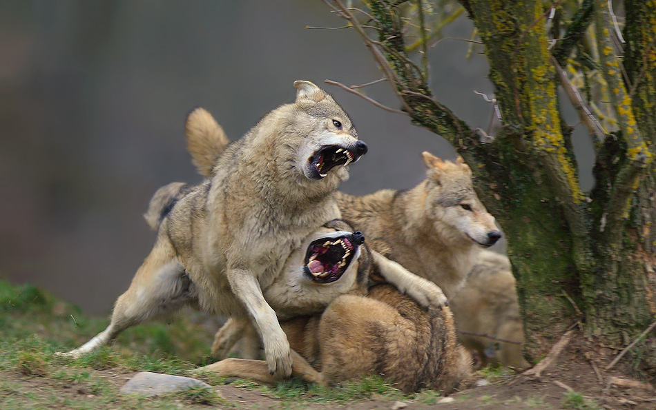 Straordinaria sotto tutti gli aspetti, a partire dallo sfondo e via andare. Espressività eccezionaledei soggetti, nitidissimi. Fenomenale l'aria serafica del lupo più indietro, non coinvolto dalla sfida per la supremazia. Bellissimi esemplari, tra l'altro (be', almeno questo non è merito tuo; il resto però sì). Ora vado subito a cercarmi informazioni sul parco di Gevaudan, ricordo di avere visto qualche anno fa un bellissimo servizio al riguardo alla televisione.