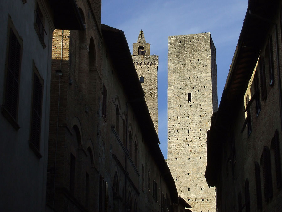 La prima impressione e' che la messa a fuoco sia caduta prima del soggetto, ovvero delle torri. Torri che sono soprattutto la destra un po' sovraesposte. La casa bianca a sinistra poi non c'entra nulla con tutto il resto, evidentemente e' stata ristrutturata di recente, quindi la taglierei. Visto il tipo di soggetto credo sarebbe stata meglio una inquadratura verticale.