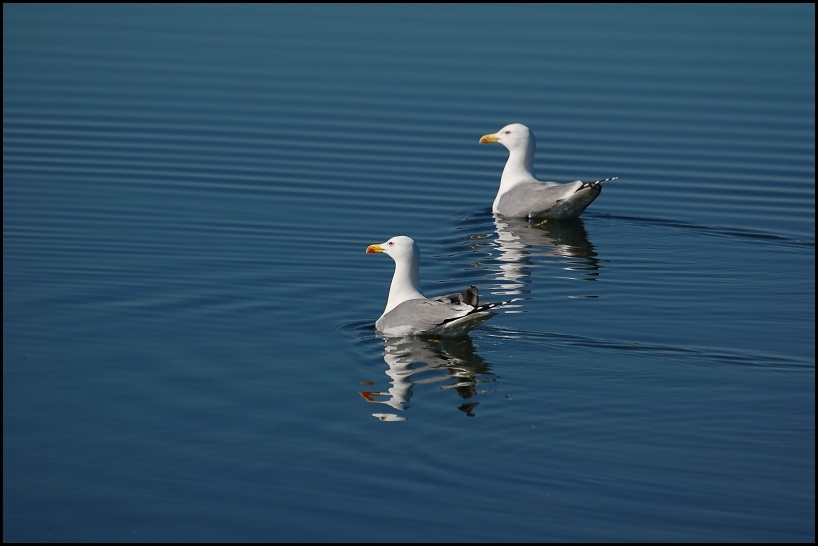 Bella. E mi garbano un sacco leincrespature parallele dell'acqua nella parte in alto. Oltre, naturalmente, ai due gabbiani che navigano paralleli come due navi in parata, le teste fieramente erette.