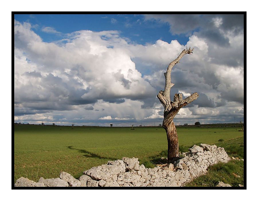 La delicatezza e l'uniformità del prato si scontra contro la forza minacciosa e cupa del cielo cosparso di nuvoloni imponenti...a far da tramite un muro a secco diroccato e le forme contorte di un tronco attaccato dal tempo e dalle forze della natura...cosa chiedere di più!