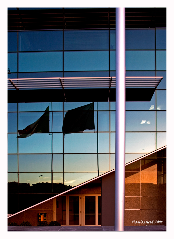 una moltitudine di linee, di cromatismi freddi e caldi, di riflessi ambientali come il sole che batte nella parte bassa e la scena urbana che riflette nello specchio, il tutto è spezzato da questo portabandiera in primo piano...tutto perfetto, molto intrigante Wink