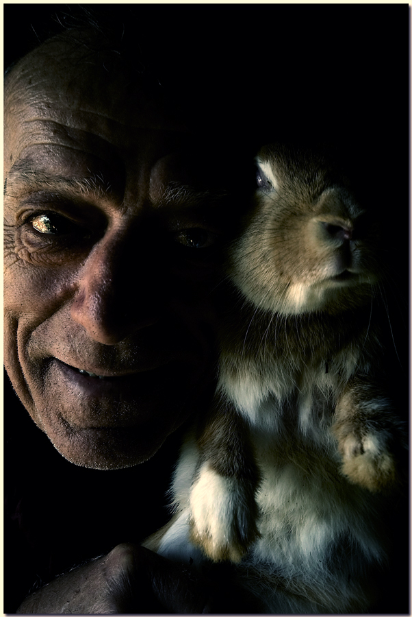Mamma mia! Questa foto mi trasmette inquietudine. L'occhio di lui, quello appena accennato del coniglio...il viso dell'uomo che scompare in quello del coniglio sembra indicare quasi una metamorfosi (accentuata dall'appena intelligibilità dell'occhio sinistro dell'uomo e di quello destro del coniglio). Il viso di lui è reso in una maniera meravigliosa.