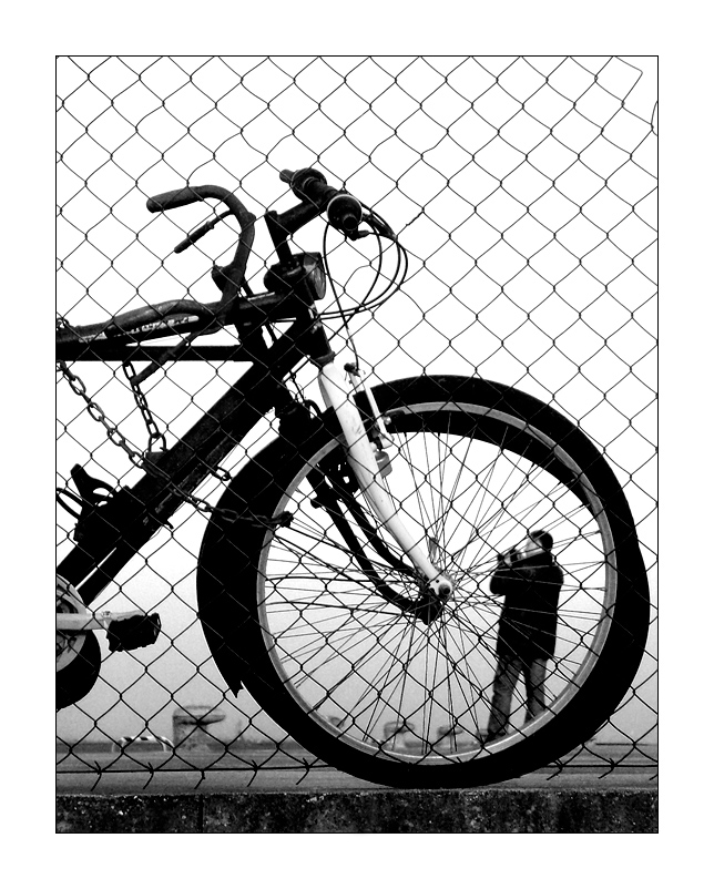 una foto più mentale che materiale, non ci vedo un movimento o dinamismo, mi sembra che ci sia una tua volontà di smaterializzare l'immagine, manca la fisicità dei soggetti, non vedo bici sovraposte come dice Pier Paolo ma ruote volutamente (per necessità) distorte, il soggetto è leggermente fuori fuoco, la rete è interrotta nel suo disegno.