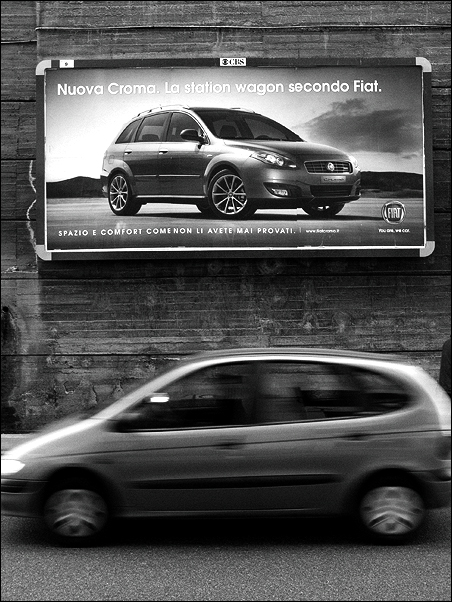 Mi piace, e non soffro il taglio.. porta l'auto vera in secondo piano rispetto a quella nel cartellone, rafforzandone il valore di "casualità", di cosa che avviene nel mondo reale mentre noi fissiamo il manifesto.