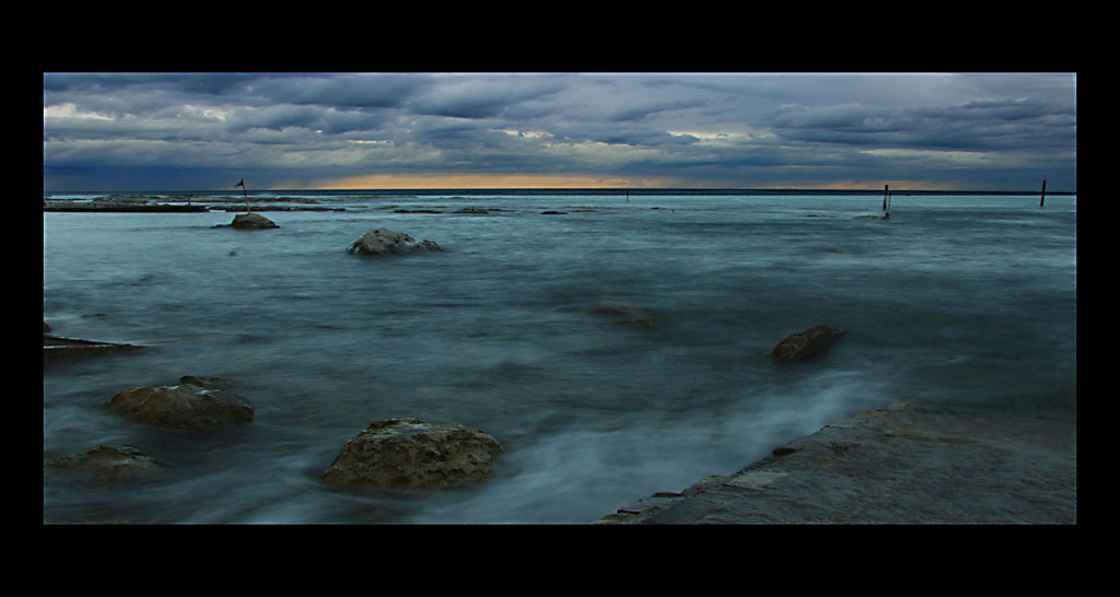..taglio panoramico e toni della fotografia che esaltano il senso di tensione e attesa restituito dalla scena.... buona la scelta dl tempo di esposizione scelto, l'acqua assume un'effetto nebbiolina che sommato al cielo così caratterizzato ha un non so chè di elettrico...... bene la composizione che vede la leggera diagonale a rafforzare la sensazione fino ad ora percepita...... se sei rimasto per molto tempo senza scattare non hai comunque perso di certo la mano